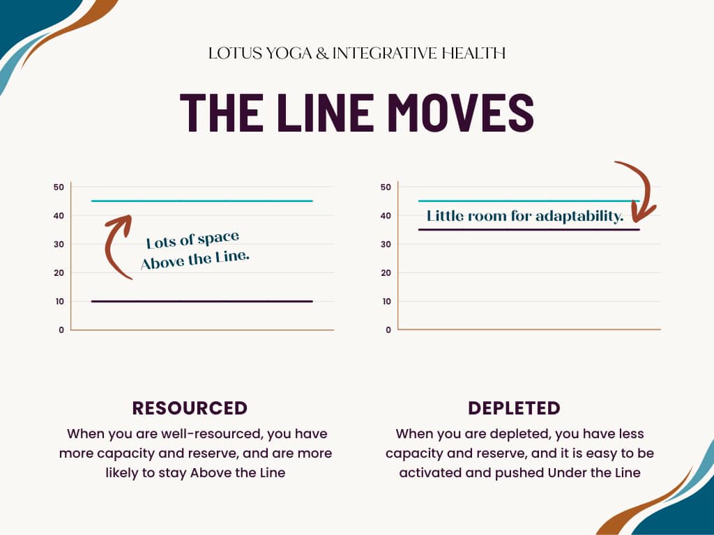 When we are below the line, we are in survival mode, and because we are not well-resourced, we are easily overwhelmed, protective, and reactive.